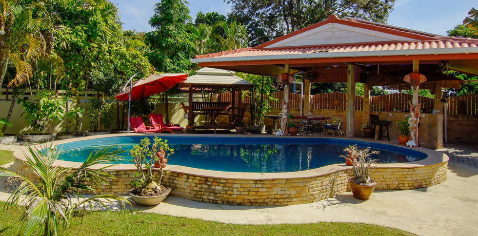 Das Highlight ist der große Pool mit Loungeecke und überdachtem Barbereich. Hier kann auch gegrillt werden.